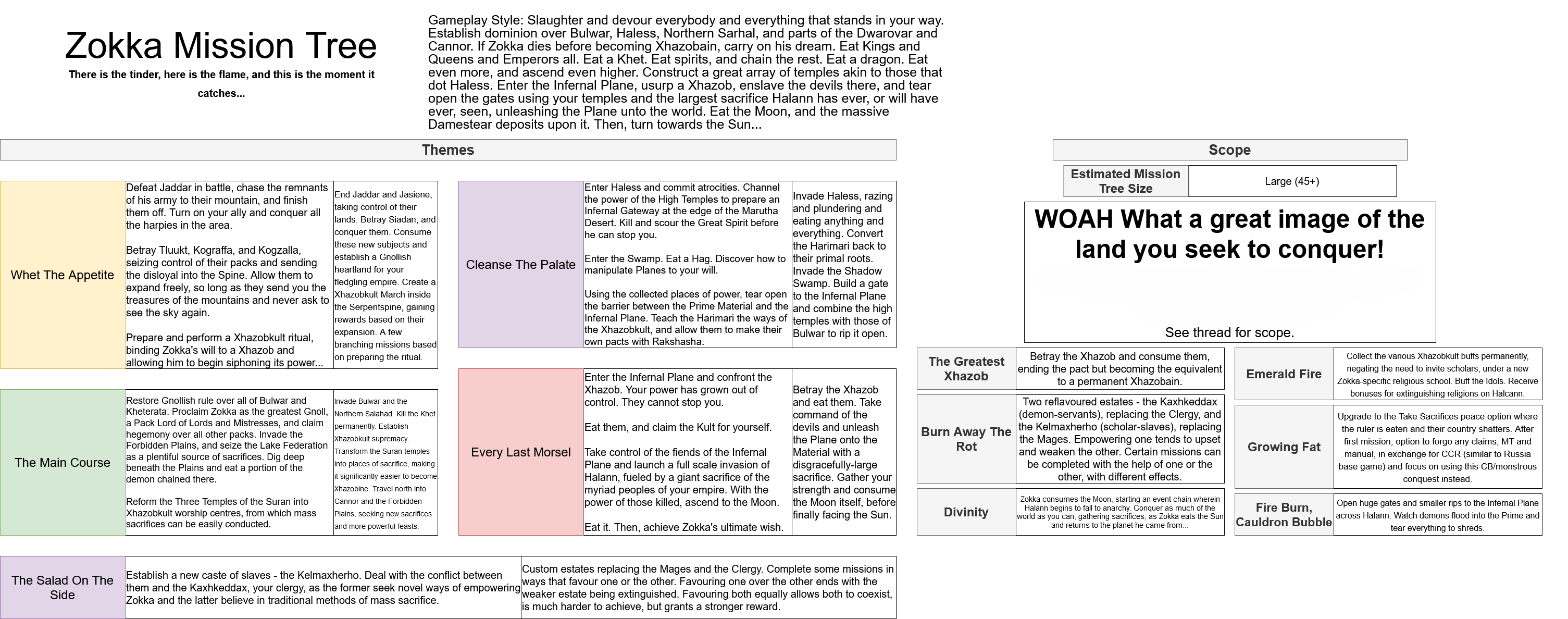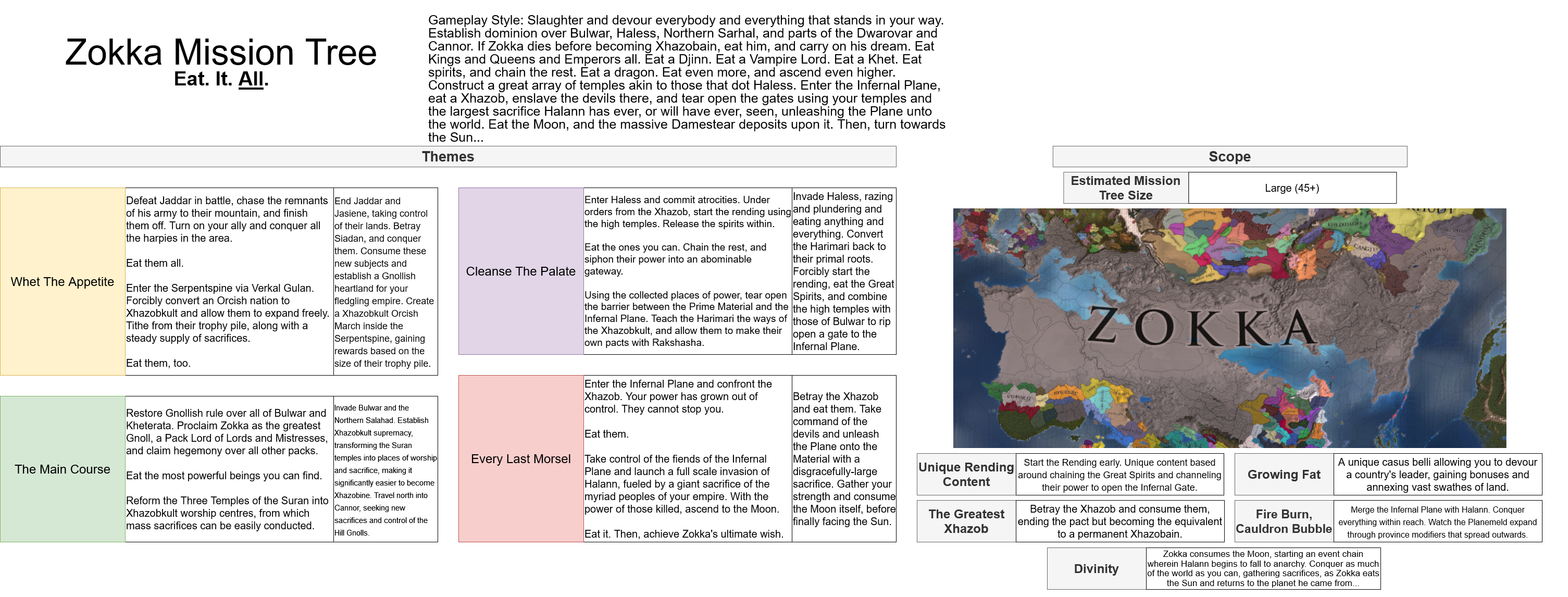 My most recent contribution to Anbennar was a mission tree for the country of Zokka. This was my most significant contribution to the mod in terms of sheer scope, but also my most structured thanks to the familiarity I developed when creating my previous mission trees.